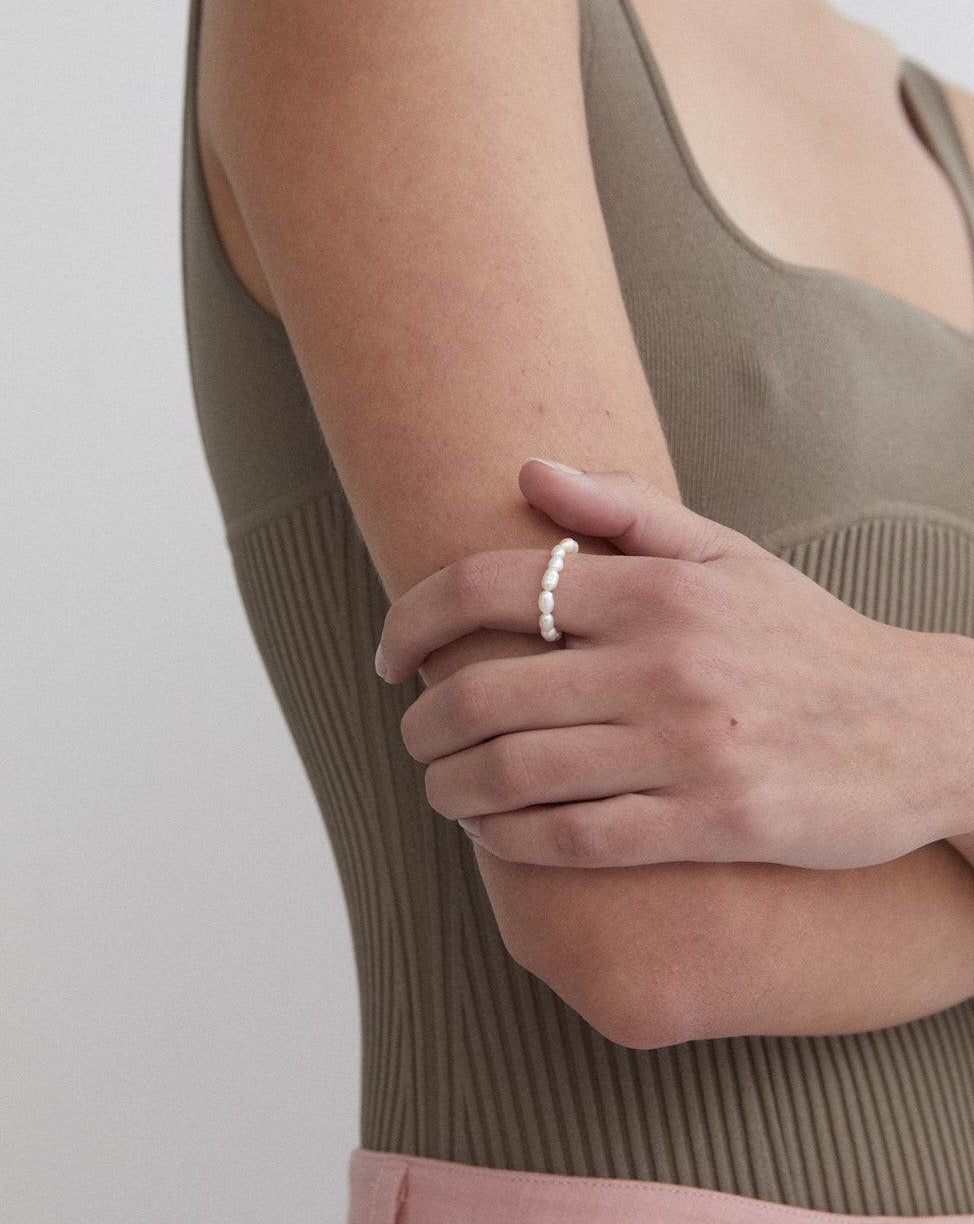 Beautiful as a stand-alone piece or stacked with contrasting styles, Freshwater pearls are strung together to form this delicate beaded ring.